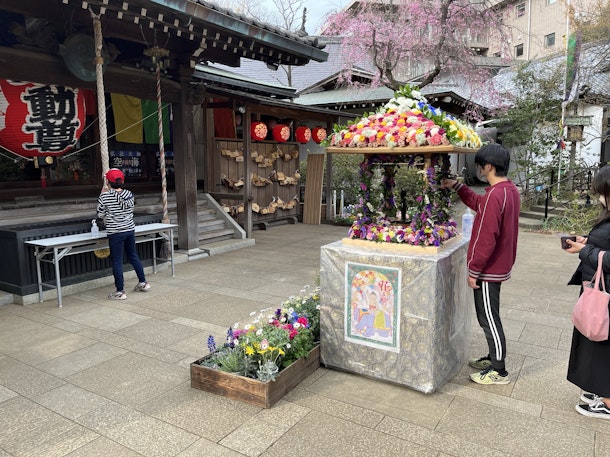 4月8日金曜日午後2時より、世田谷区の等々力不動尊で、花祭りのお祝いイベントが開催されます。山門からのお練り行列と花御堂での法楽を見学し、甘茶をかけてお釈迦様の誕生を祝います。