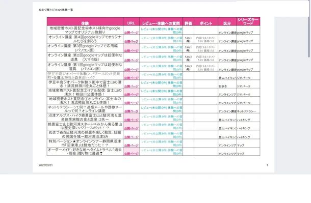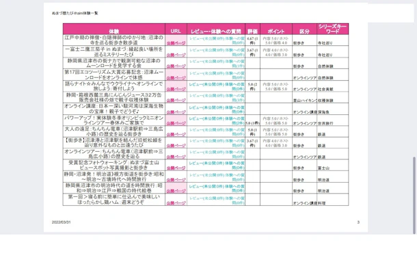 ぬまづ歴たび@白妙博明提供の体験一覧をExcelデータで創ってみました。(2022年3月31日現在)