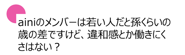 Kei)笑。ainiはWantedly(求人情報サイト)で見つけたの。元々持っているユーザーサポートスキルが活かせるし、なによりフルリモートという条件に惹かれた。年齢不問というのも私には大きかったかな。今年66歳になったから。(ええ!!)