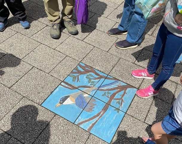歩道に点々と続くタイルたち。「この鳥は何?」「さっき、同じタイルがあったかも!」