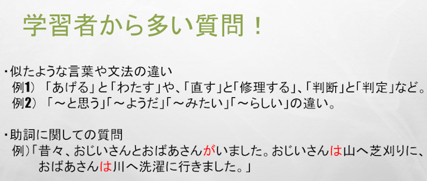また今回、事前にゲスト様からいただいた「学習者の方から多い質問」については、こちらをお話させていただきました。