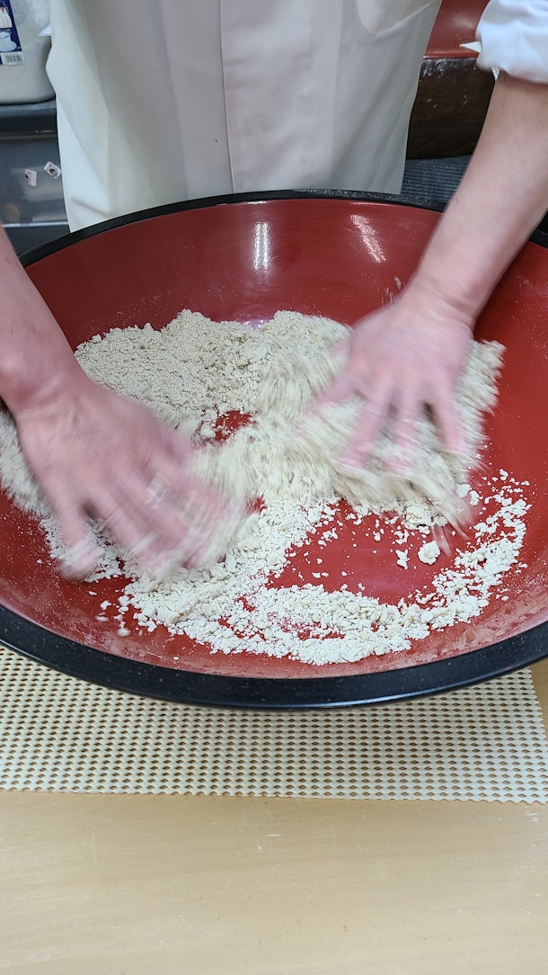 蕎麦粉を捏ねて細く切るまでの工程を安藤さんのデモンストレーション→自分の順で繰り返していきます。少人数制なのでゆっくりマイペースで進められるのが良かったです。この日初めて知ったのは蕎麦粉の香り!ちょっとピーナッツのようで香ばしい香りがするんですね。ちなみに小倉庵は北海道産の蕎麦粉を使用した二八蕎麦です。