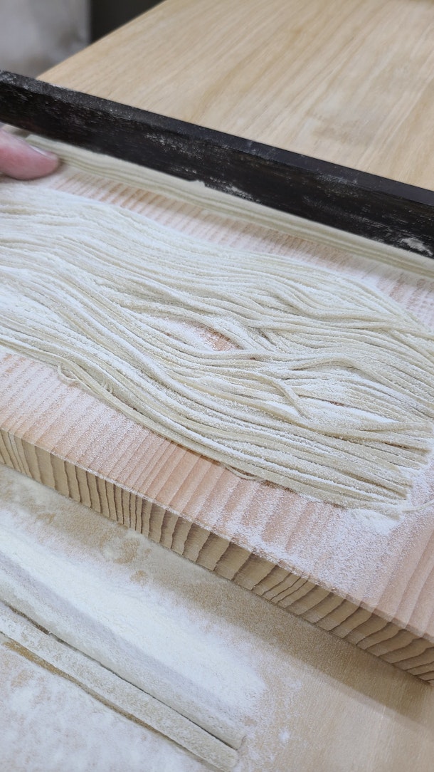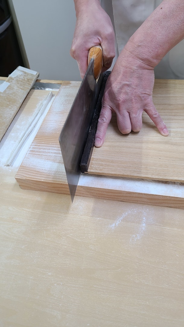 蕎麦は風邪を引かすなという言葉があるそうで、蕎麦のタネは乾燥させないように包んで大切に扱います。そして出来る限り均等にするのがポイントで、麺棒で伸ばす際一番気を使いました。なんと言っても蕎麦打ちのハイライトは切る工程ですよ。重みのある大きな包丁で蕎麦の上に置いた板をずらしながら切っていきます。安藤さんがリズミカルに作業するのを見て”なるほど〜”なんて思いましたが、実際は凄く難しい!!!
