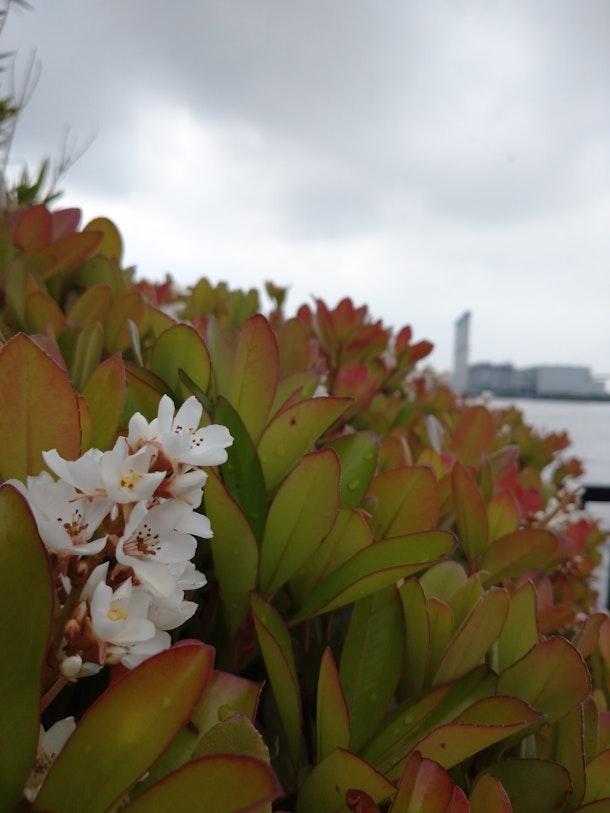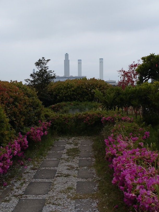 海芝浦駅ホーム横には海芝公園が存在する。つつじが鮮やかである。