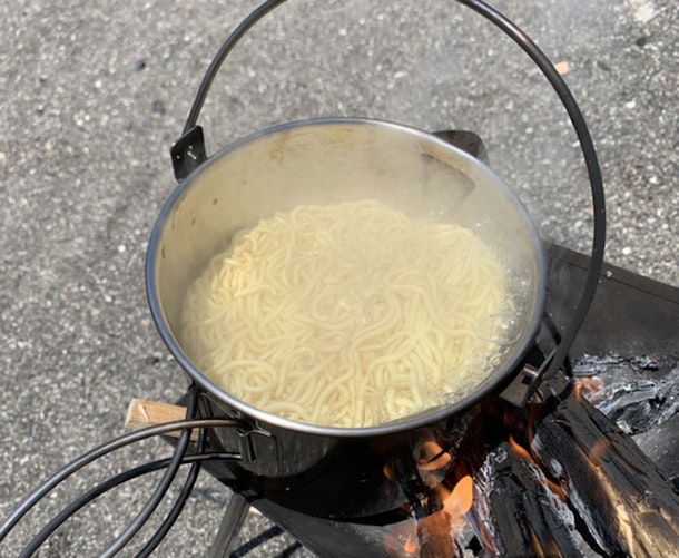 できるカップヌードルより、沸騰後(ラーメン投入後)も小さな焚き火台でお湯を沸かし続けないと