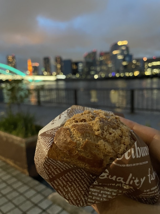 東京タワーが見える築地大橋近くでスイーツを食べながら暗くなるのを待ってます!