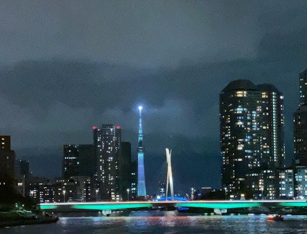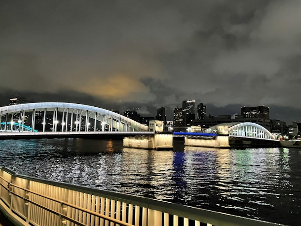 中央大橋は橋柱をライトアップ。遠くに永代橋。