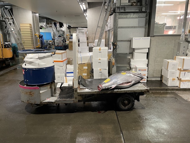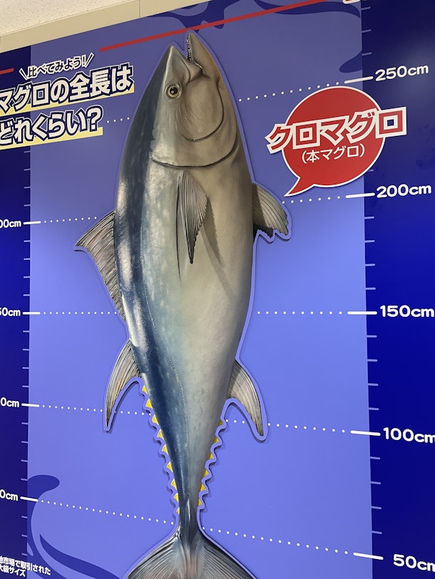 豊洲市場水産仲卸売場棟でマグロと背比べできます。