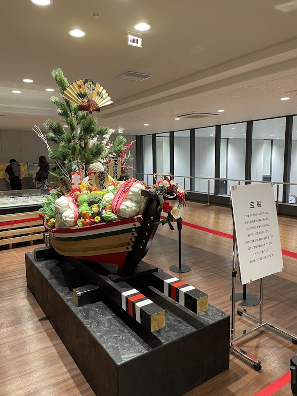 青果市場には、正月の縁起物の宝船のレプリカが登場。正月明けの初セリで野菜とフルーツの詰め合わせの宝船がセリされます。