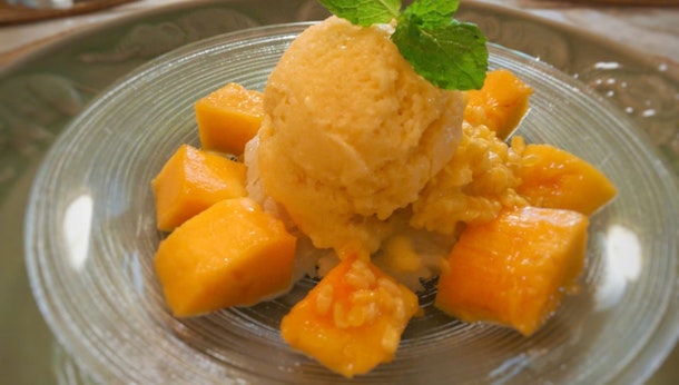 チキン煮込みヌードル&揚げ春巻き&マンゴーともち米のデザート