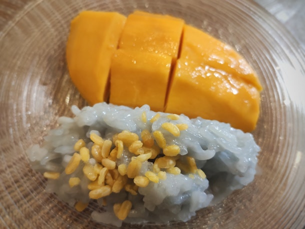 ココナツミルクで甘くしたもち米と一緒に食べるのがタイ風。