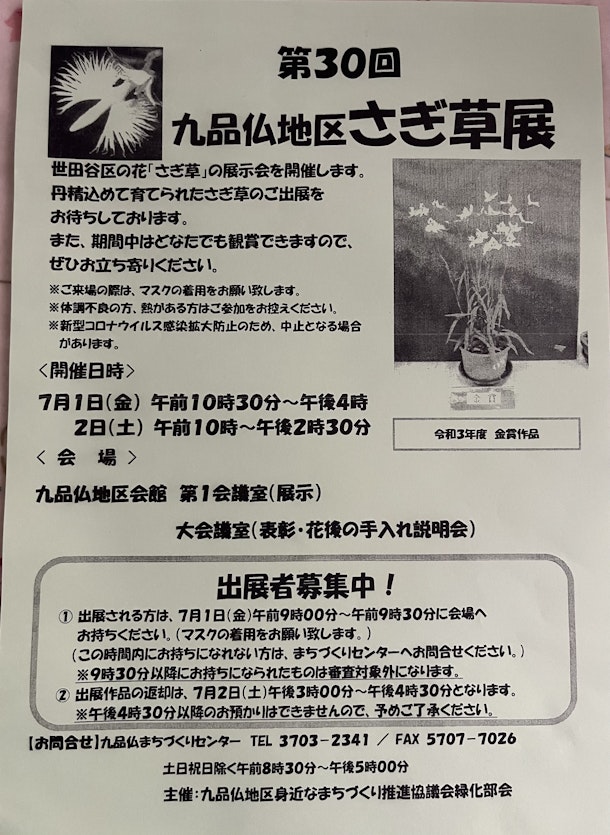 世田谷区の花、鷺草の展覧会が7月1日2日に開催されます。【九品仏浄真寺】阿弥陀如来参拝、鷺草伝説、奥沢城の土塁と城外の地形観察コースに予約登録下さい。世田谷に伝わる鷺草伝説をお話します。鷺草展を見て、八幡中学校の鷺草校舎を見て、九品仏川緑道にある鷺草の里の石標の前で、このコースのまとめ解説を行います。