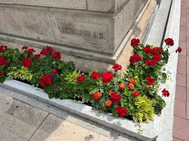 日本大通りにあるレトロな建築が花に映えます。