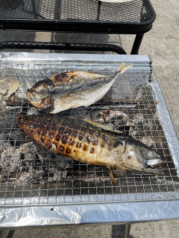 サバも大きいので家の中で焼く結構ギリギリですが、BBQだと焼きやすいですね。