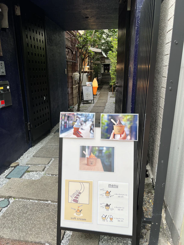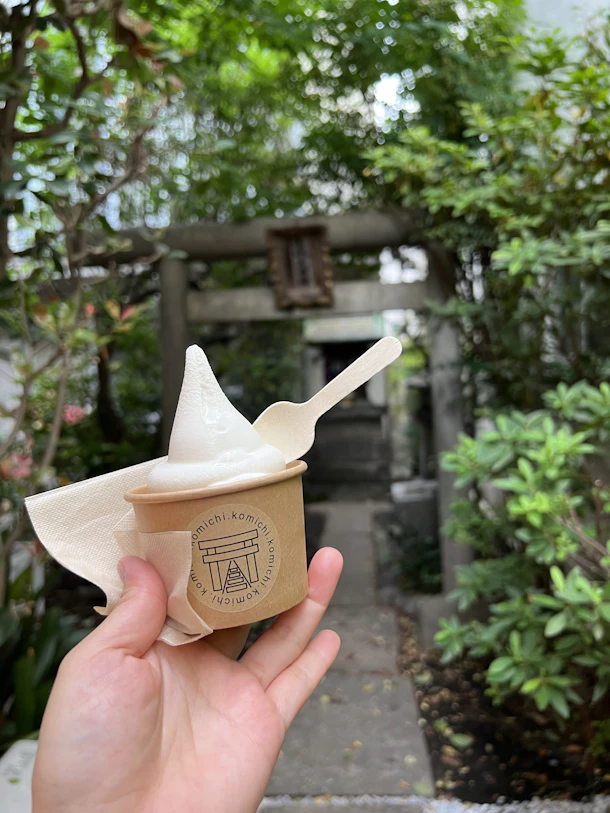 美術館の帰りにふらりと寄った谷中銀座商店街に、前からあった家の扉が開かれ、奥に白蛇様が祀られている生魂神社の⛩あるソフトクリーム🍦屋さんが5/23にOpenしたとのことでした♪