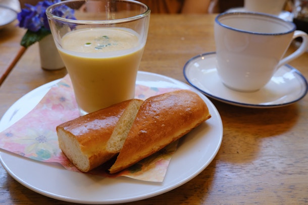 こちらは焼き上がったばかりのパンと冷製スープ。サンドイッチ用に作られた柔らかいパンを一足先にいただきます。スープはかぼちゃのポタージュ(冷製)