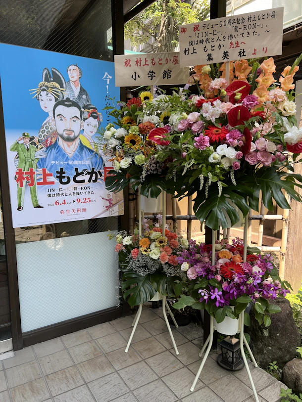 6/4の初日、お祝いのお花がたくさんの弥生美術館で開催中のデビュー50周年「村上もとか」展に行きました。