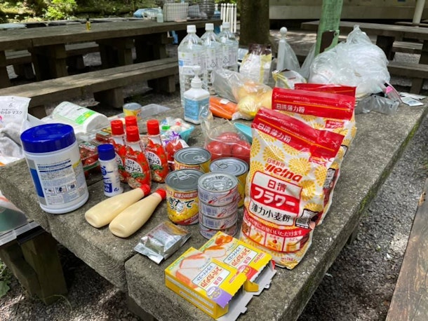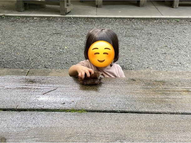 空になったペットボトルに水を汲んで、汚れた石のテーブルの上にかけて、タワシでゴシゴシ、ゴシゴシ。