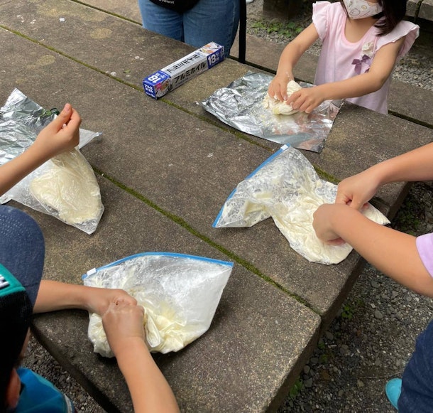 Kidsチームはそれぞれジップロックの袋を持って、思い思いに必要なものを入れてもらい、一生懸命コネコネにトライ。