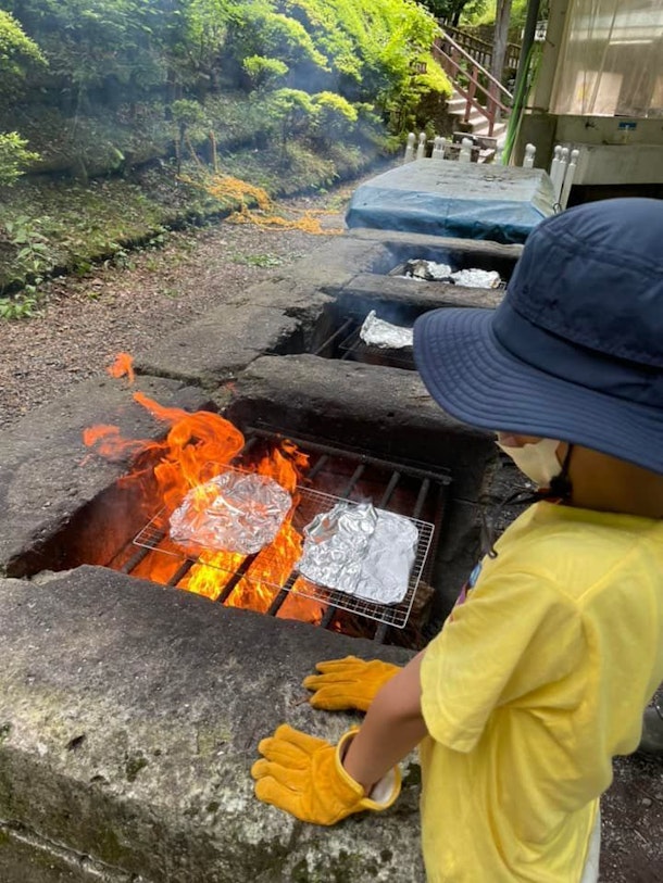 大人チームが懸命に薪をくべ、火起こししてくださった釜の上でいよいよ焼きます。