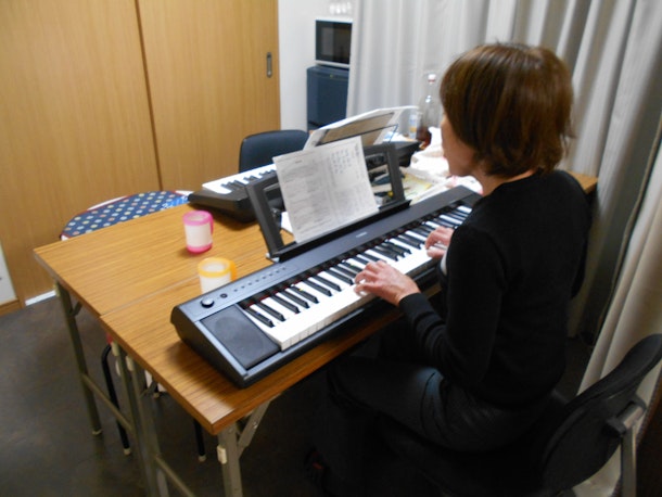 1月16日は18時からタビカのワークショップで「平安女流文学❝源氏物語❞を唄って実感!紫式部の名文と和歌を吟詠体験です https://tabica.jp/travels/2390 」を開催し、女性一人が参加されました。①キーボードで音階を弾きながらの、発声練習です。