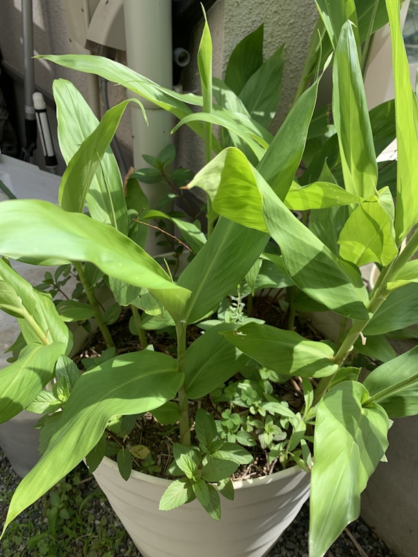 White gingerの若い葉っぱ (今年から食卓に活躍しているこの植物↓)