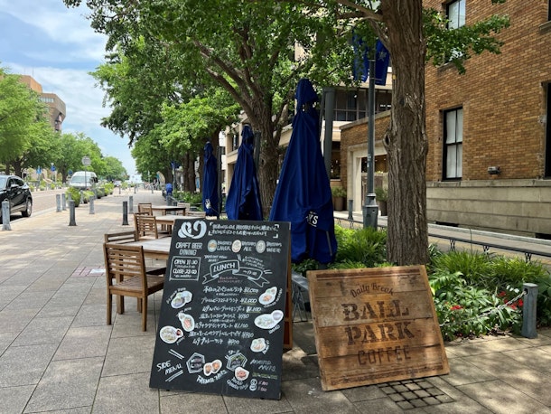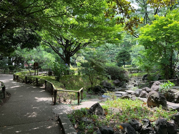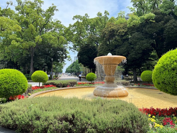 横浜公園では緑に囲まれたエリアを歩きます。