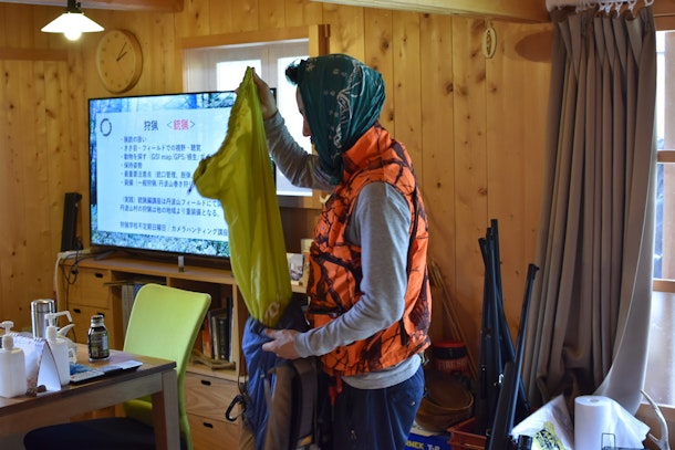 現役猟師のスタッフが、実際に山に入るときに使っている装備を一つ一つ説明しました。登山道具と被るものもあれば、狩猟特有の装備も多数。