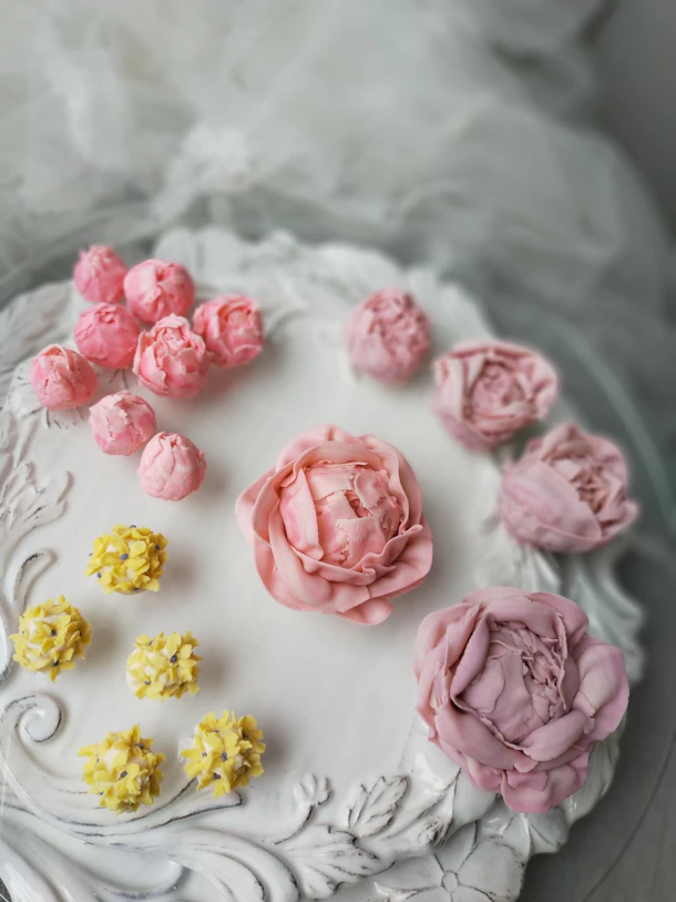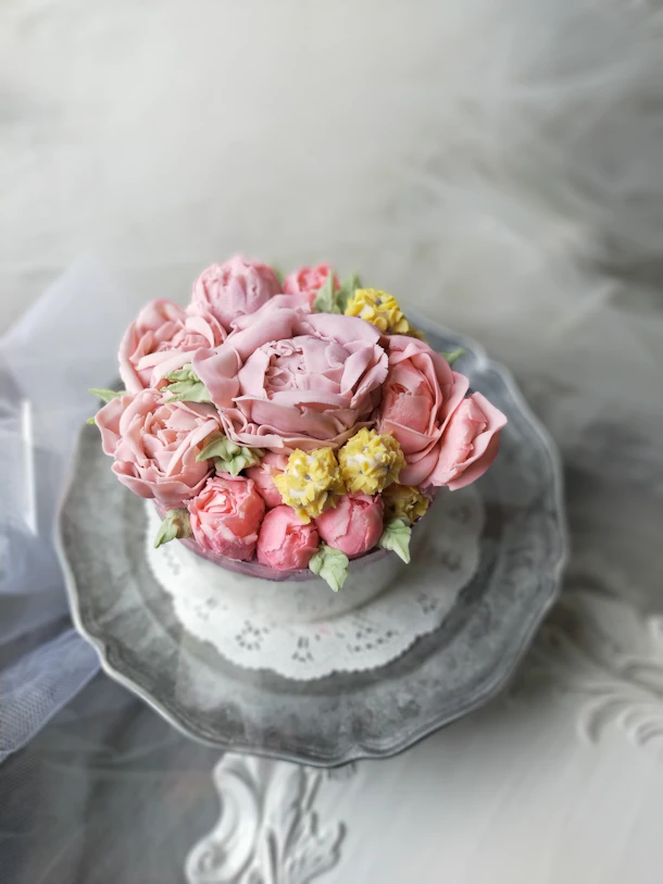 花びらが途中で切れてしまう部の解決策もお伝えさせて頂きました。絞られたお花を全てデコレーションし、華やかなブーケのようなケーキが完成しました。