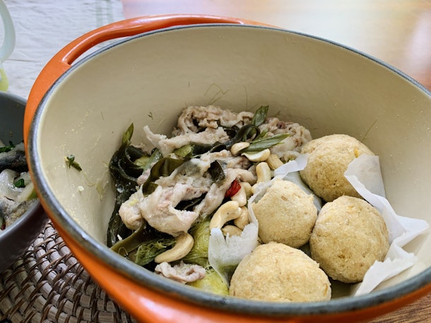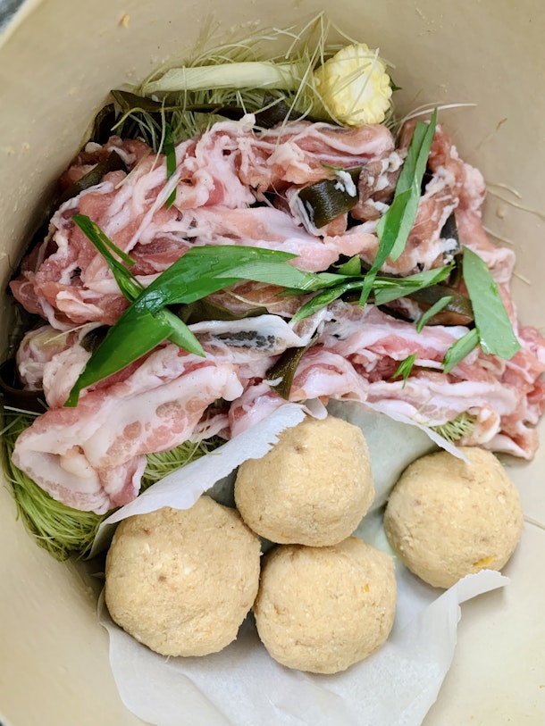 baking paperにcorn,昆布、生姜の葉っぱ、豚肉(醤油漬け)