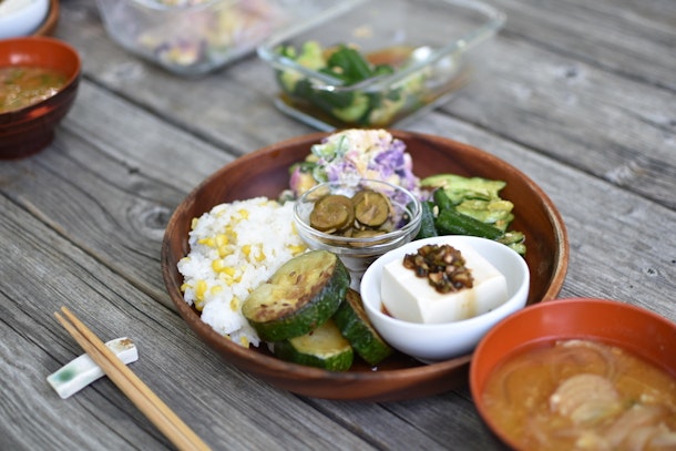 お昼ご飯は、我が家の畑で採れたての野菜を中心に、夏野菜たっぷりのメニューです。