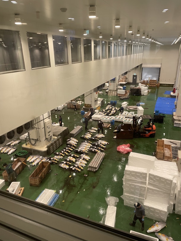 豊洲市場、朝早く訪れたときは、この窓から大物売り場を見下ろしてみましょう。