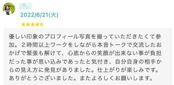 今回のゲスト様からは、撮影データのオンライン納品よりも前の、当日夕方に、レビューをいただけましたので、レビューのキャプチャ画面からご紹介したいと思います。