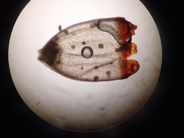 サヤゴケの蒴。赤いところが蒴歯。緑色っぽい小さな丸は胞子。黒い大きめの丸は空気。
