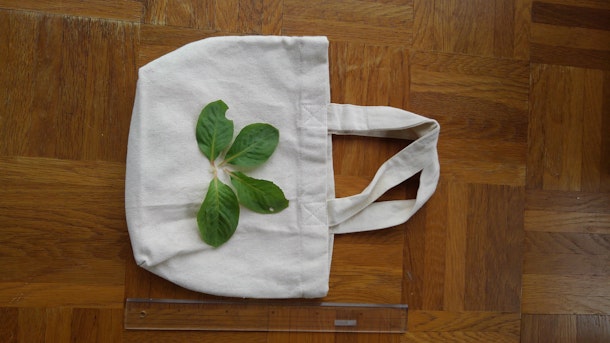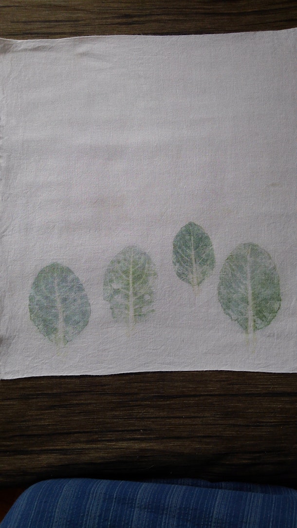トートバッグ(持ち手まで30cm)丸葉がかわいい。下は布巾の染め上がり。