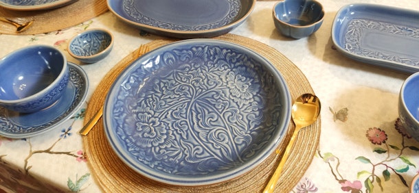チェンマイからブルーのセラドン焼き持って帰りました!