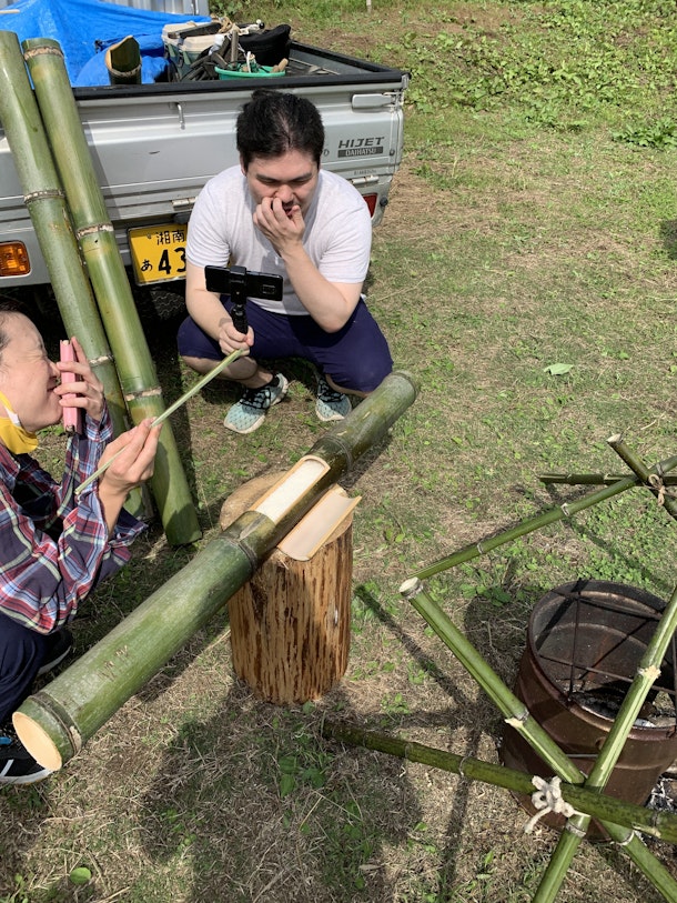 (竹はんごうで炊くご飯の味に感動する二人😆)