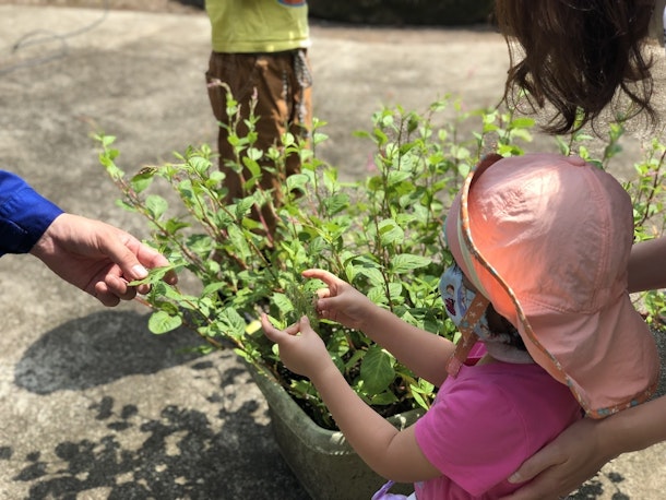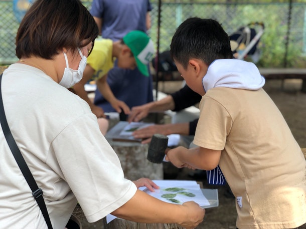 子供たちは各自で藍の葉を摘み取り、布の上に葉をお好みの形に並べて、染める準備をしました。