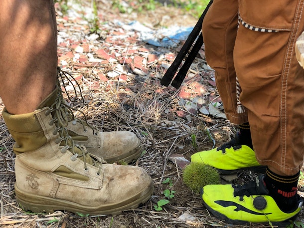 直接手で毬栗を触るのはとても痛いので、口が少し開いている毬栗を探して、足でいがを開けました。