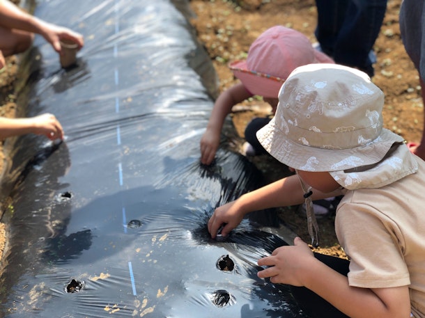 暑い中、子供たちみんなは頑張って、丁寧に種を蒔きました。