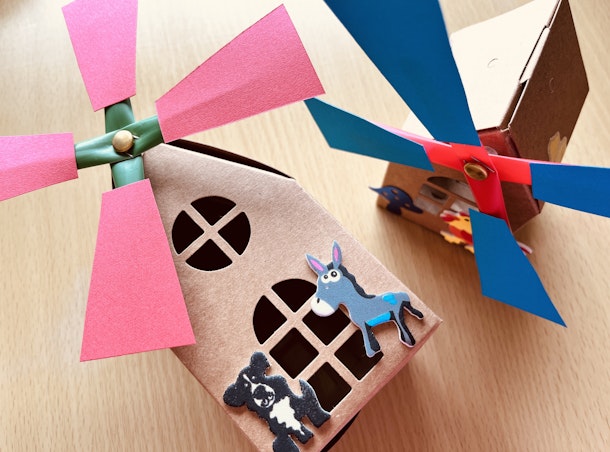 お家を組み立てて、ストローやビーズ、割りピンを使って風車を!