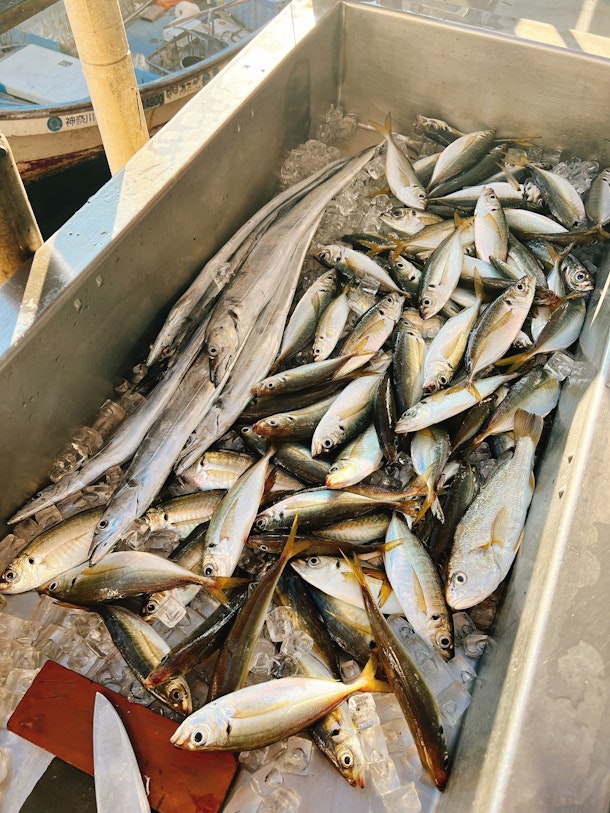 前日から北風が吹き続いていたので波が高めだったので慣れない方には苦戦でしたが、全体で80尾程度のアジ(20㎝~)とイシモチが釣れました。