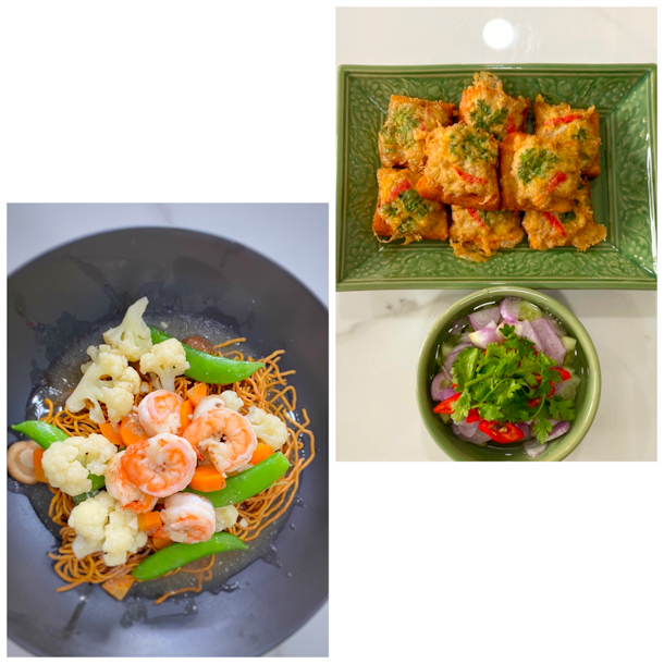 1)ラードナー(タイ風あんかけ焼きそば) 食材は自由に変えられます。(海老の代わりに豚肉など)