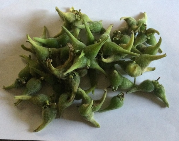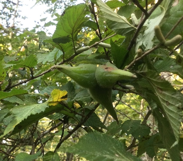 日本のヘーゼルナッツ、ツノハシバミが実をつけています。今年は鳥に全部取られないうちに収穫。すでに枝には来年の実を作るための短い棒のような雄花が2個ペアでついているのがわかります。