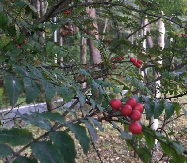 6月に取り残した山椒の実が真っ赤に。赤は鳥を惹きつける色。何しろ鳥は目は良いから、どこからともなくやって来て実を啄んでいます。先ほどの葉脈標本と一緒に飾りにしたら、きっと素敵なカラーコンビネーション。で、私も少しもらいました。