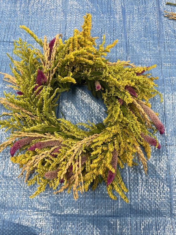 サツマイモの蔓を使って土台を作り、秋の草花をあしらったリースを作りました。