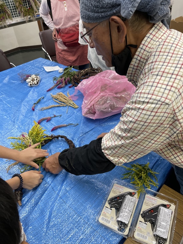 今回は、畑でのサツマイモ収穫体験だけでなく、場所を移して『秋の草花を使ったリース作り』を実施しました。