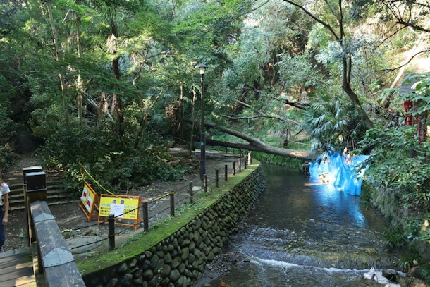 9月19日の大雨台風により等々力渓谷の不動の滝より上流の地層露出面の大木が崩落しました。地層を見る道はご覧の通り通行禁止ですが、左の稚児地蔵に行く道は通行できます。崩落後初めて、今日お二方をご案内しました。