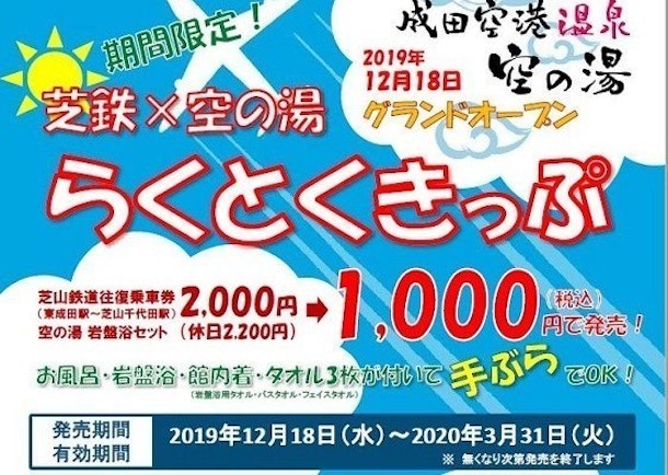 芝山鉄道往復乗車券と空の湯岩盤浴セット(お風呂・岩盤浴・館内着・岩盤浴用タオル・バスタオル・フェイスタオル)が通常2,000円が1,000円に。