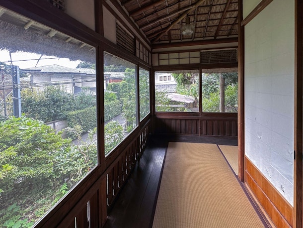 続いて大きな和硝子越しの縁側から緑の庭を眺める和室。鳥や虫の声が近いです。